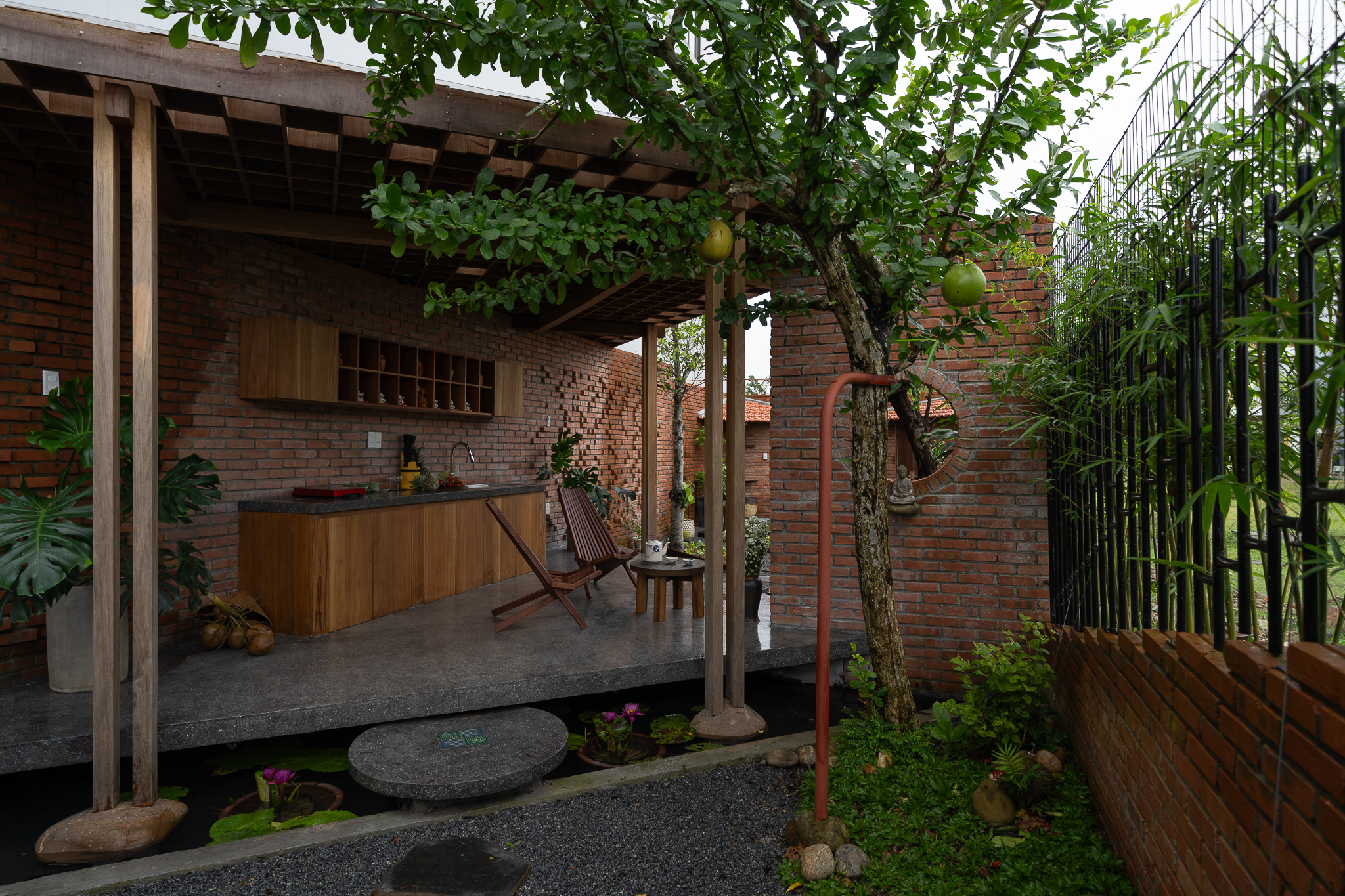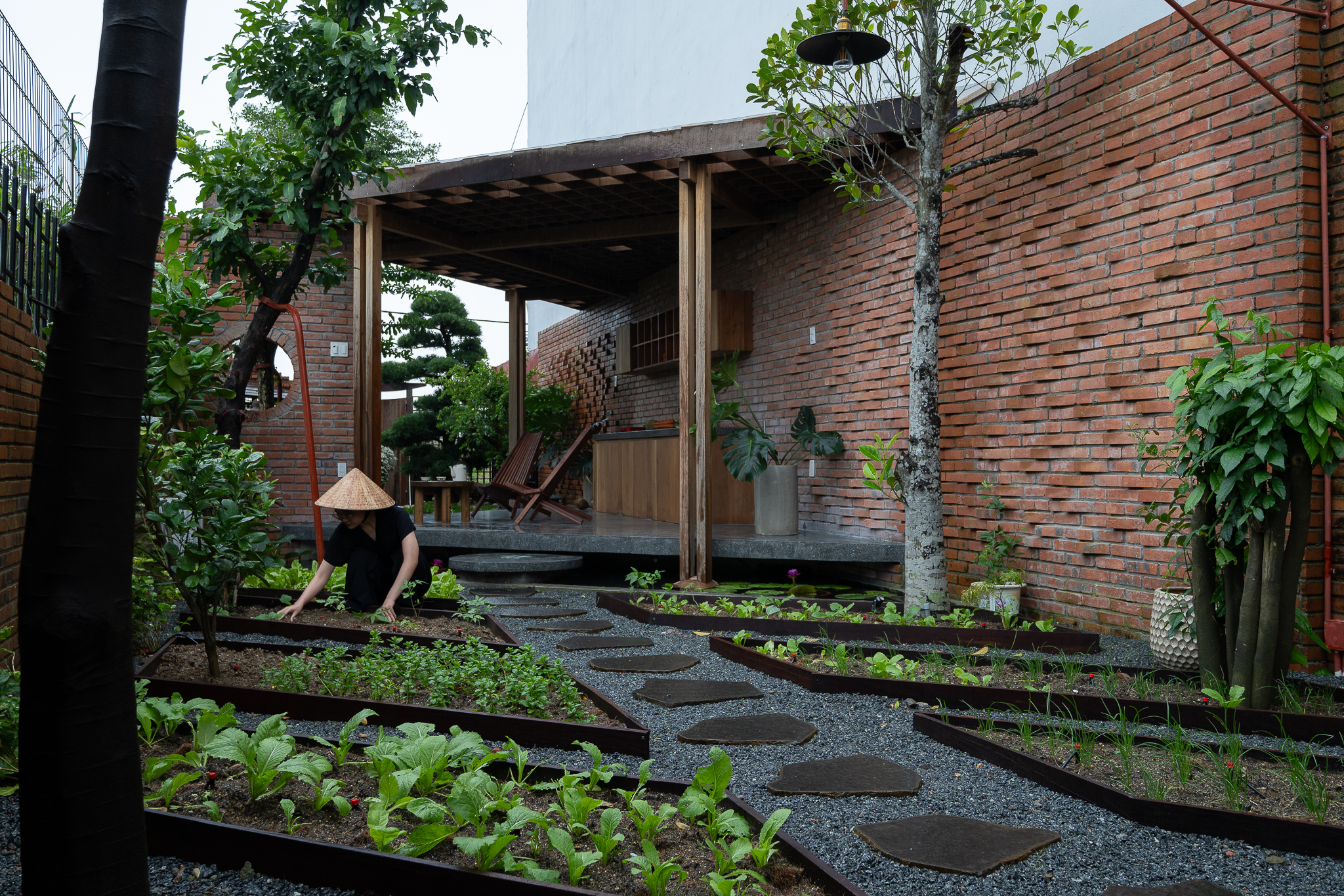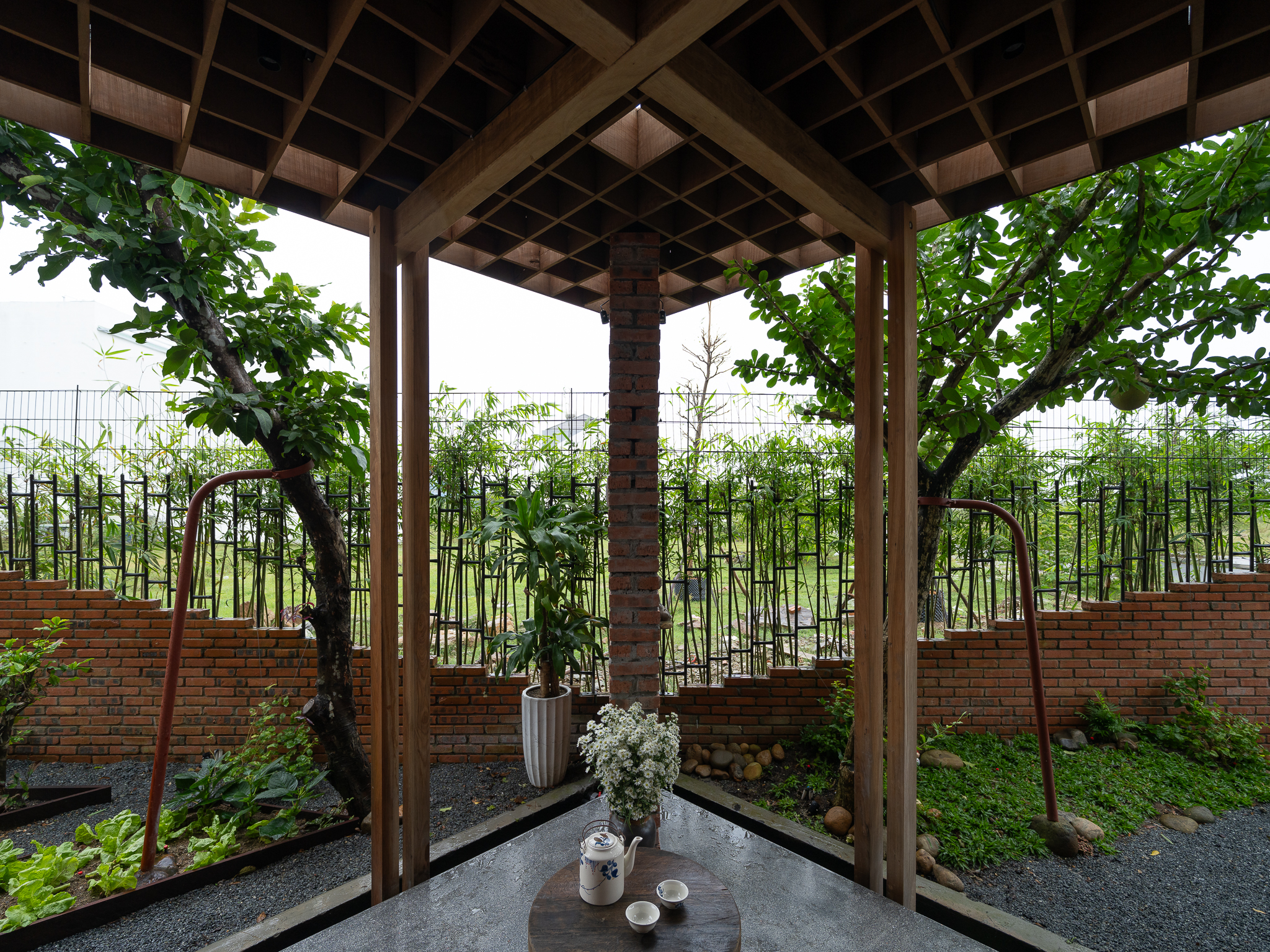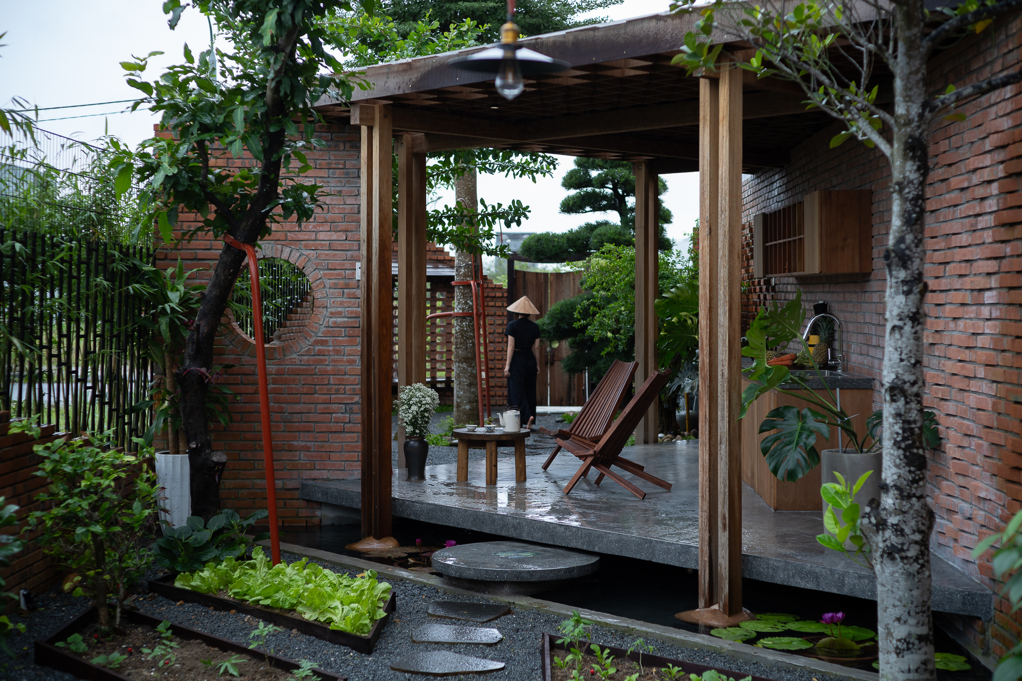 Gỗ và gạch là hai vật liệu chính được đề xuất sử dụng cho công trình. Chúng tôi muốn tạo ra một công trình có độ cảm của bề mặt vật liệu thô mộc, cảm xúc khi được sử dụng trong không gian đó. Với quy mố công trình xây dựng một cái chòi như là để dừng chân, chúng tôi bố trí một không gian bếp với một bộ ghế ngồi, cây xanh mặt nước được sử dụng vào trong khu vườn, bên cạnh đó chúng tôi đi sâu vào thực hiện những chi tiết để công trình có được độ thẩm mỹ cao.