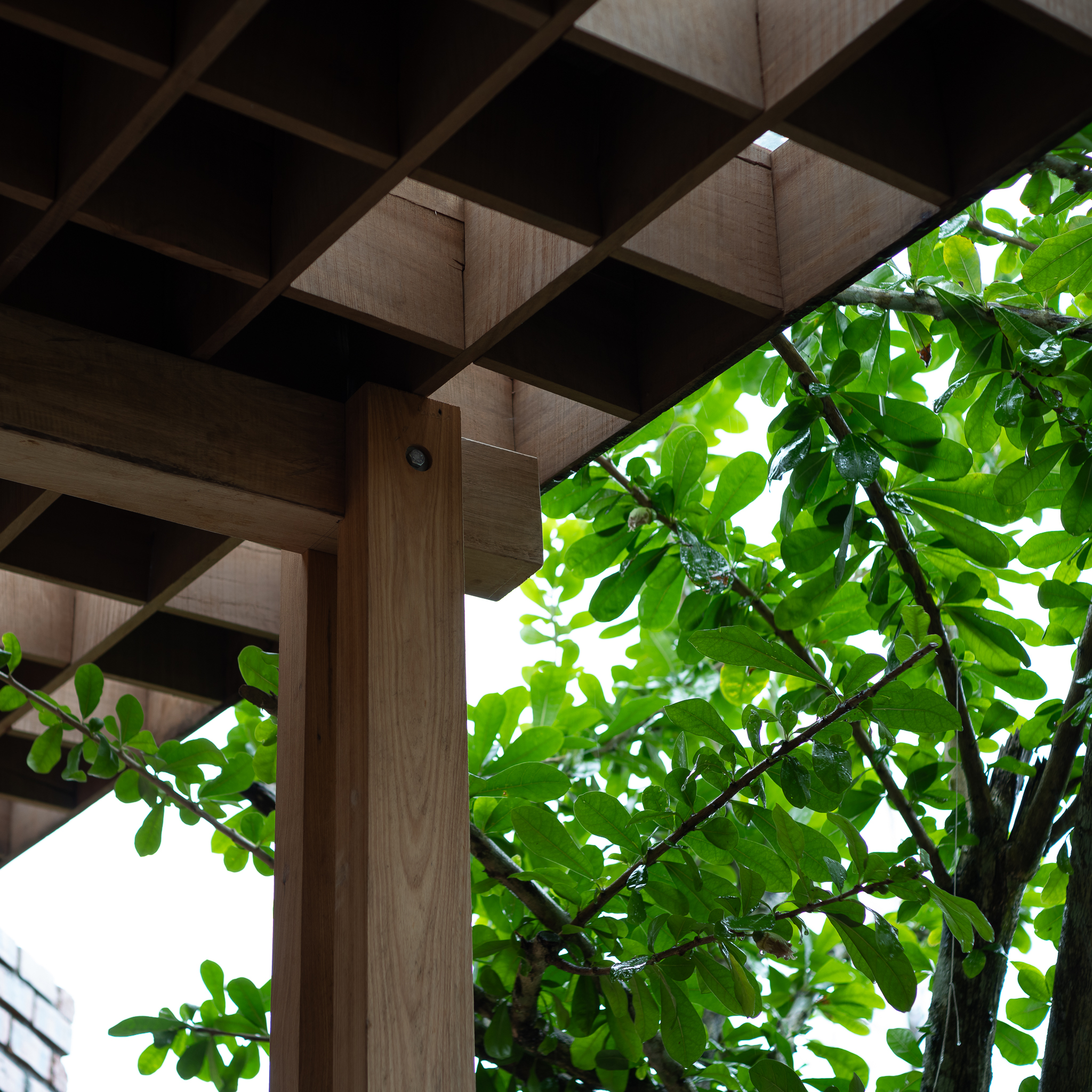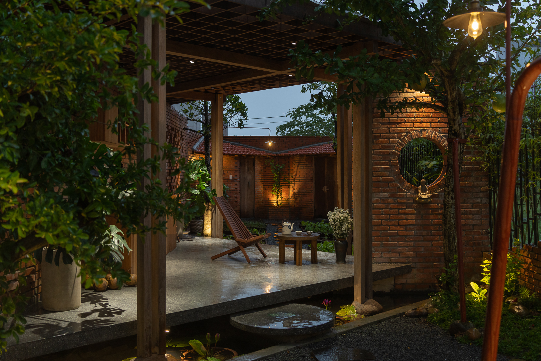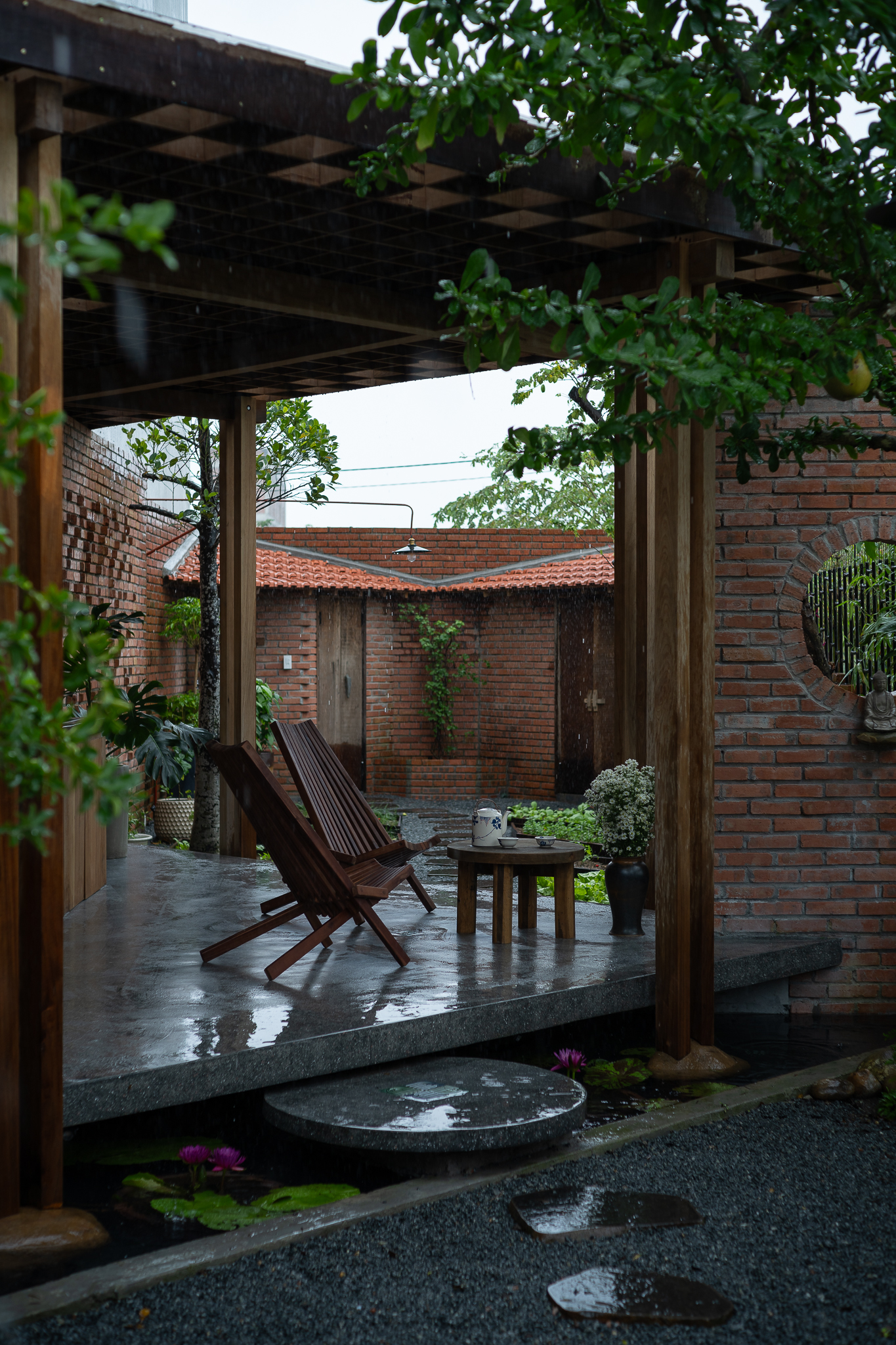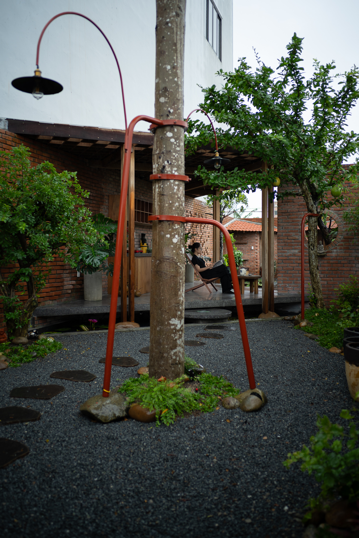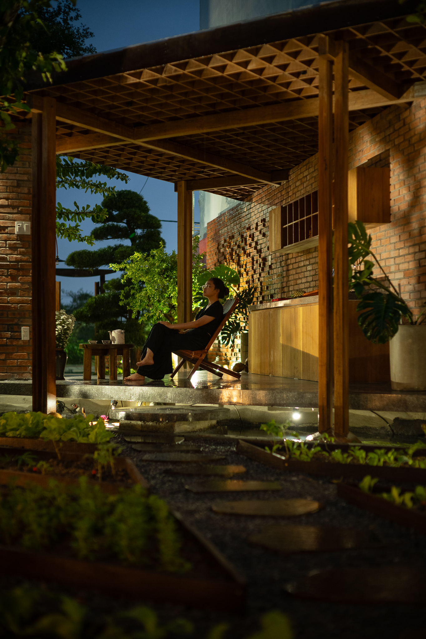 Gỗ và gạch là hai vật liệu chính được đề xuất sử dụng cho công trình. Chúng tôi muốn tạo ra một công trình có độ cảm của bề mặt vật liệu thô mộc, cảm xúc khi được sử dụng trong không gian đó. Với quy mố công trình xây dựng một cái chòi như là để dừng chân, chúng tôi bố trí một không gian bếp với một bộ ghế ngồi, cây xanh mặt nước được sử dụng vào trong khu vườn, bên cạnh đó chúng tôi đi sâu vào thực hiện những chi tiết để công trình có được độ thẩm mỹ cao.
