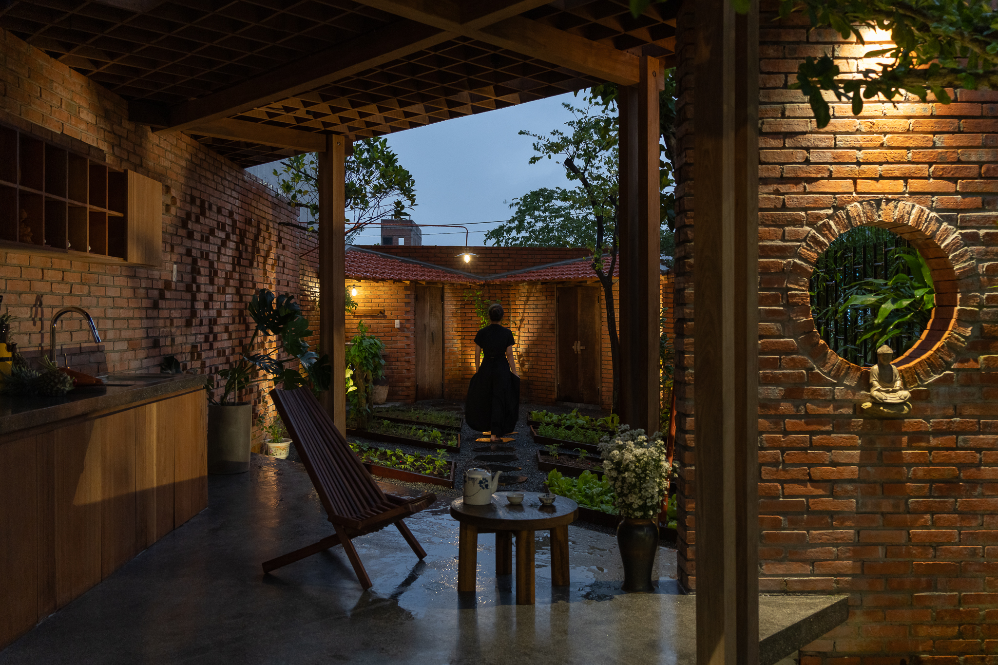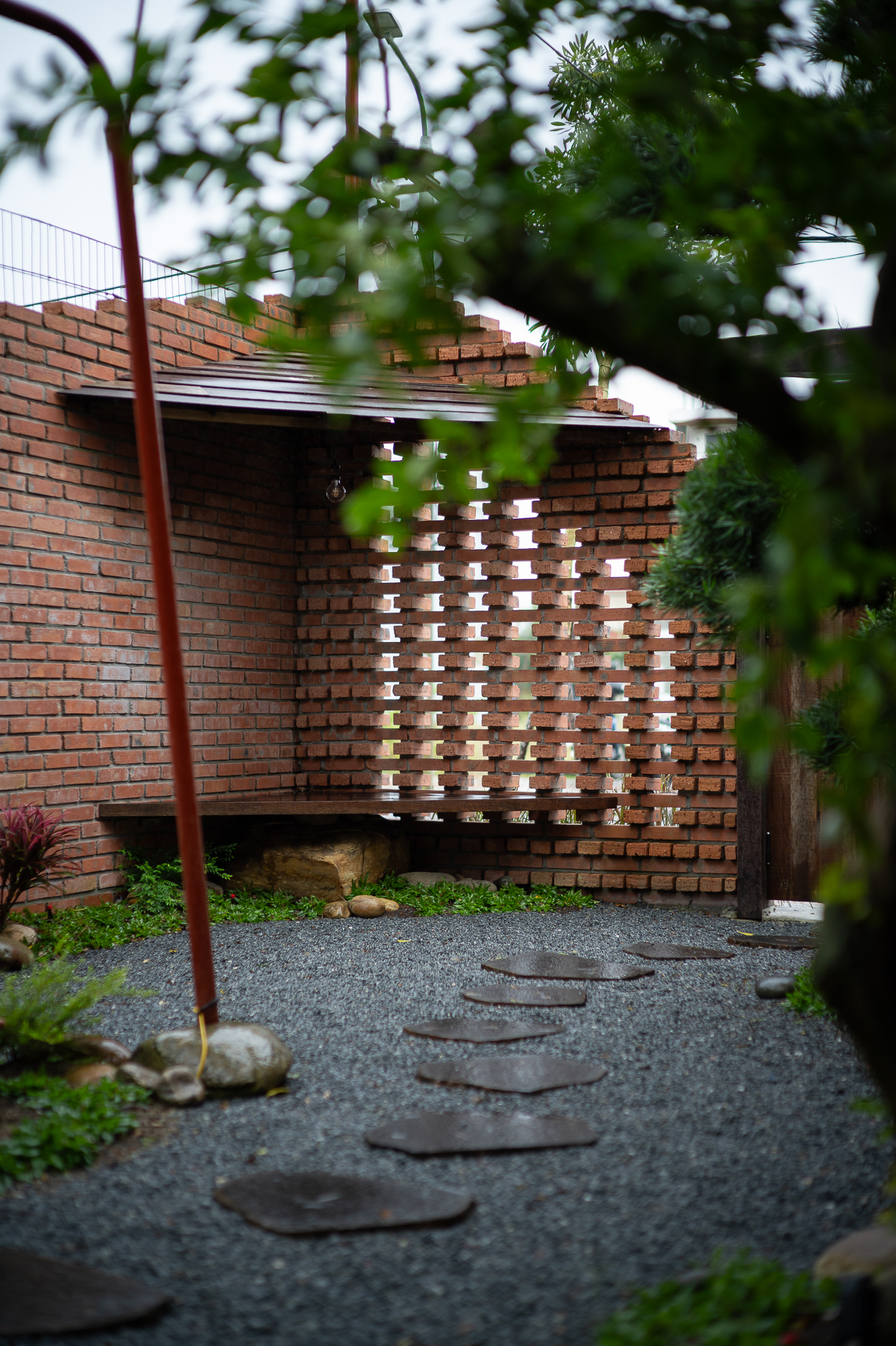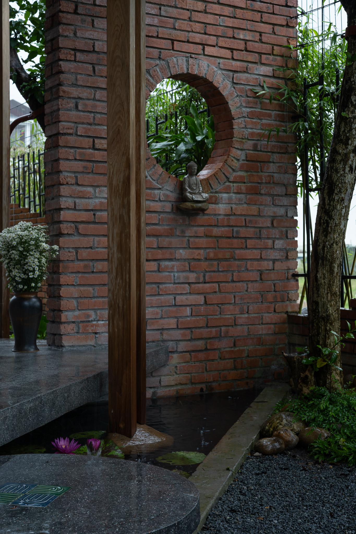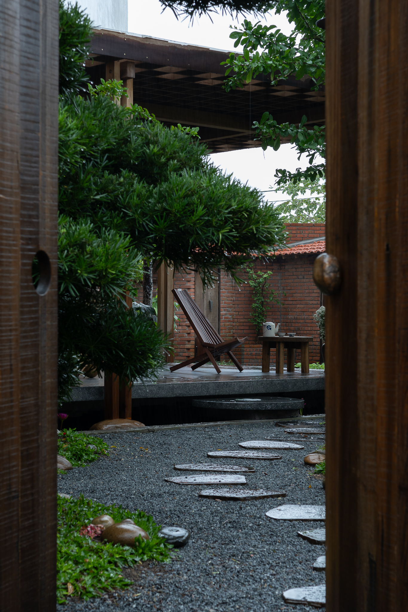 Gỗ và gạch là hai vật liệu chính được đề xuất sử dụng cho công trình. Chúng tôi muốn tạo ra một công trình có độ cảm của bề mặt vật liệu thô mộc, cảm xúc khi được sử dụng trong không gian đó. Với quy mố công trình xây dựng một cái chòi như là để dừng chân, chúng tôi bố trí một không gian bếp với một bộ ghế ngồi, cây xanh mặt nước được sử dụng vào trong khu vườn, bên cạnh đó chúng tôi đi sâu vào thực hiện những chi tiết để công trình có được độ thẩm mỹ cao.