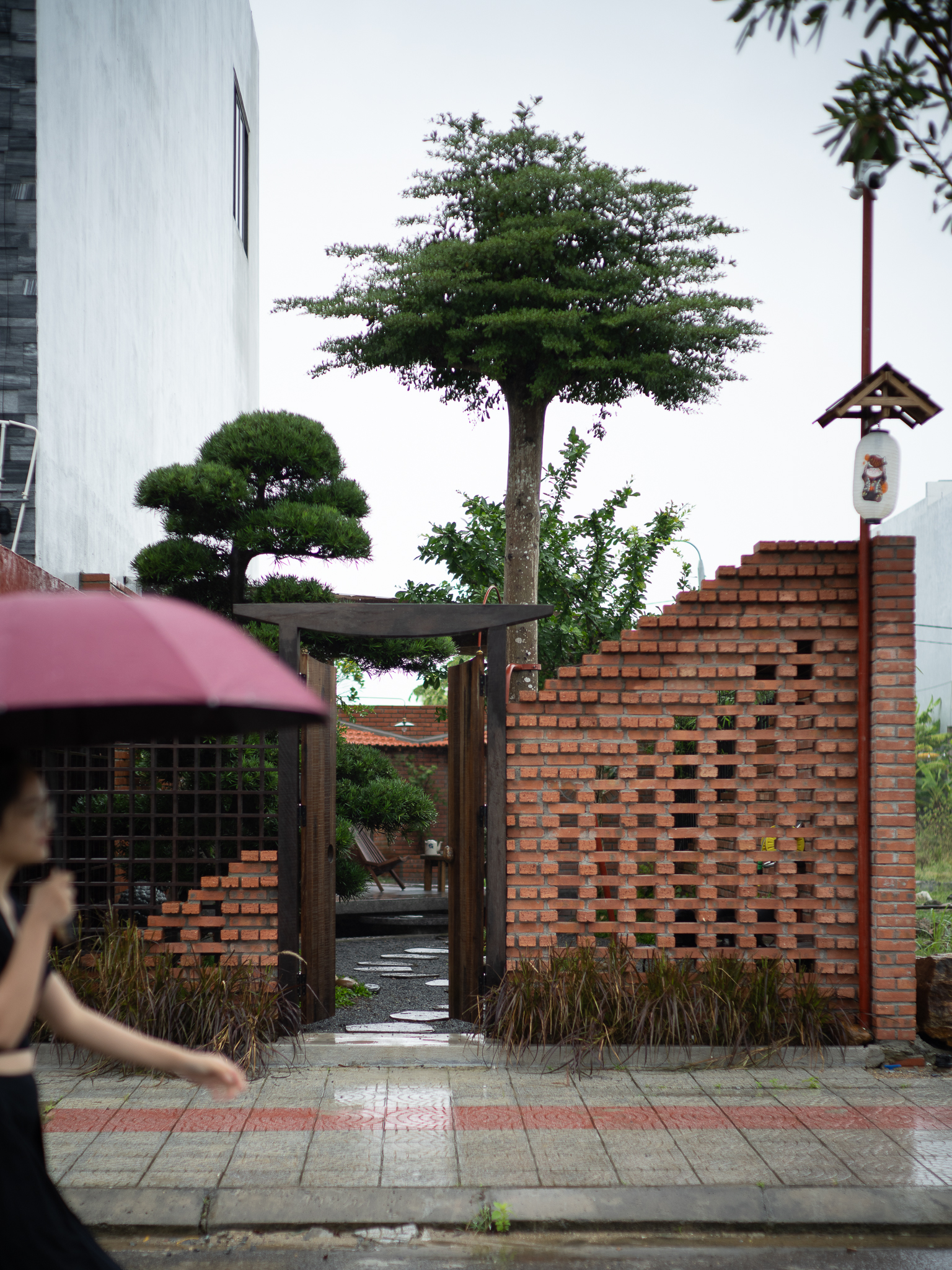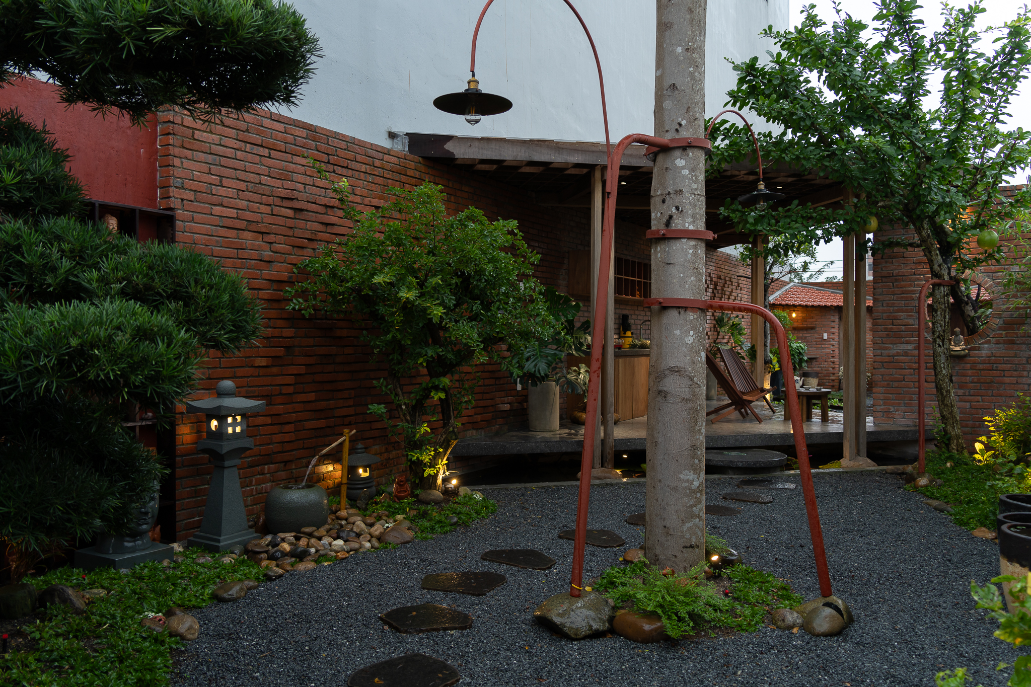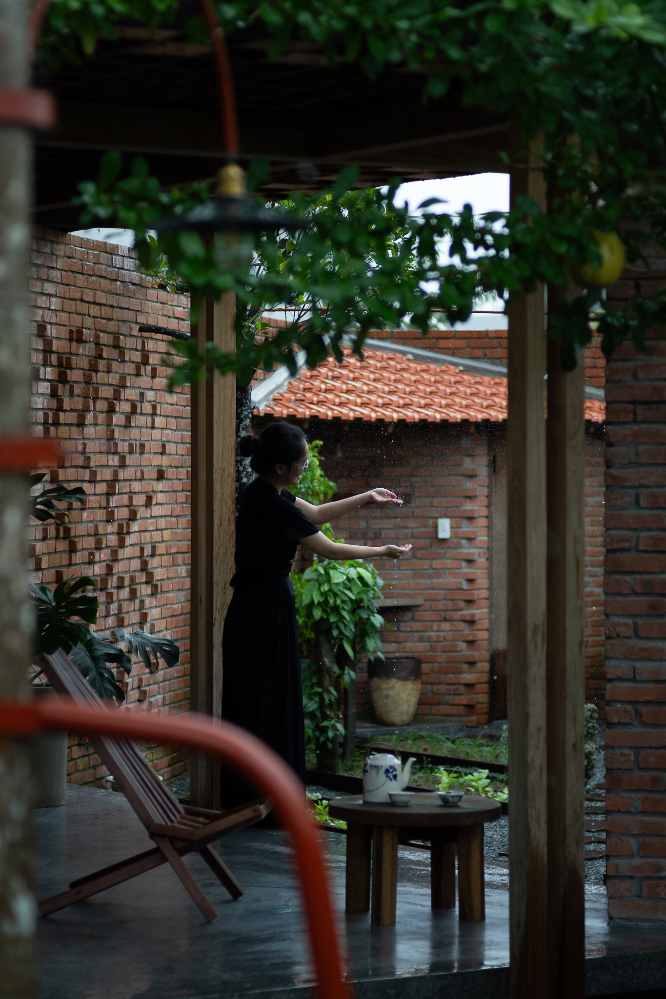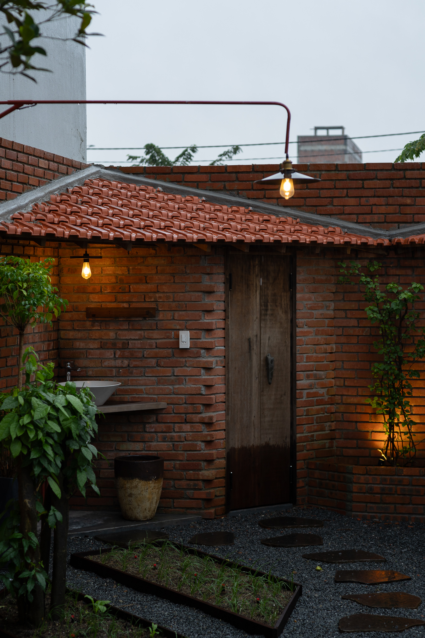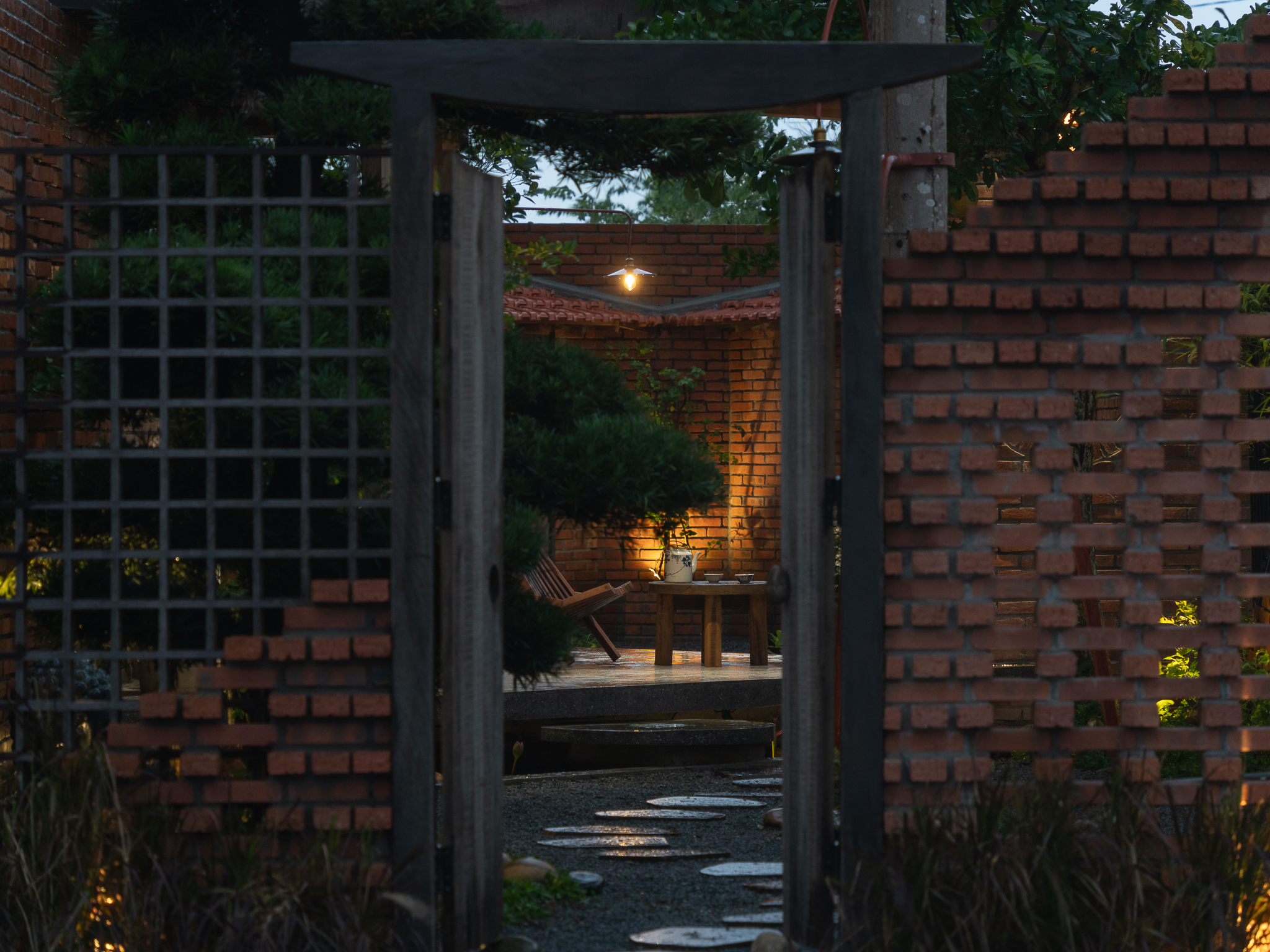 Gỗ và gạch là hai vật liệu chính được đề xuất sử dụng cho công trình. Chúng tôi muốn tạo ra một công trình có độ cảm của bề mặt vật liệu thô mộc, cảm xúc khi được sử dụng trong không gian đó. Với quy mố công trình xây dựng một cái chòi như là để dừng chân, chúng tôi bố trí một không gian bếp với một bộ ghế ngồi, cây xanh mặt nước được sử dụng vào trong khu vườn, bên cạnh đó chúng tôi đi sâu vào thực hiện những chi tiết để công trình có được độ thẩm mỹ cao.