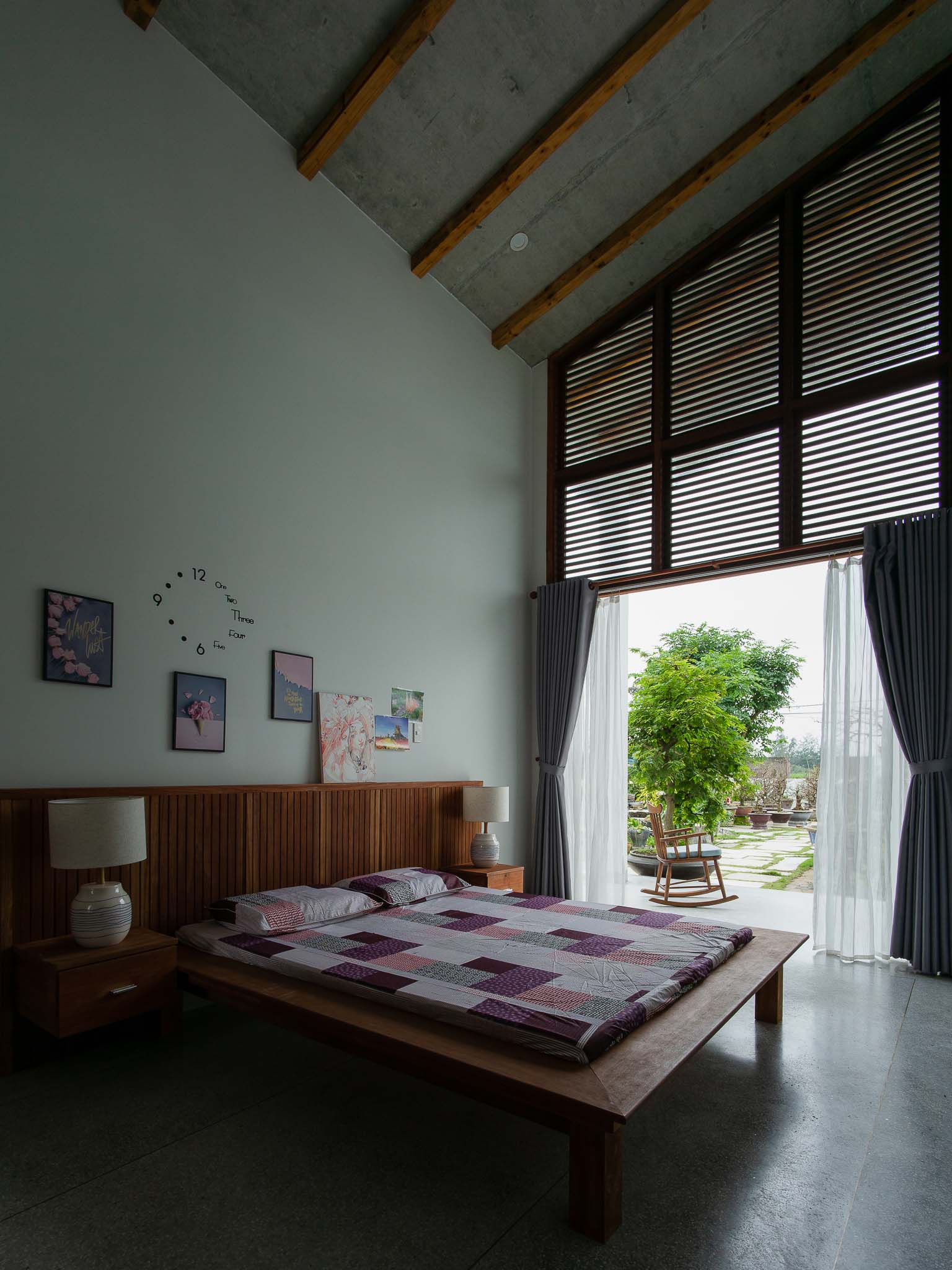 The house layout is arranged along the long side of the land, pushed towards the end of the land to create a courtyard in front of the house. The functional spaces are arranged in the main wind direction of the building.