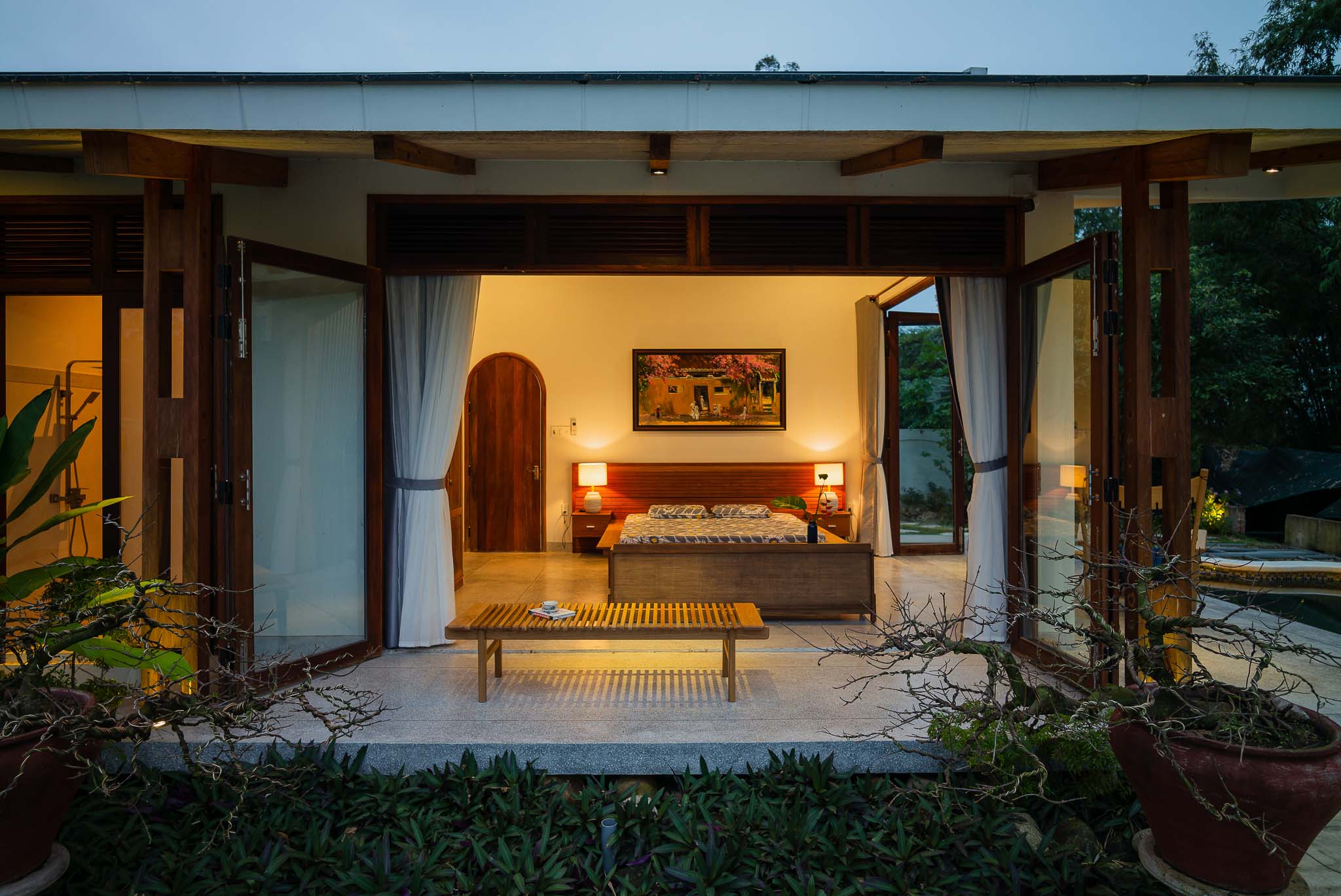 "Nhà Nhúm" has 4 sides in contact with the garden, all spaces are opened through the door system opening to the garden to ensure the house has enough natural light and ventilation throughout the day and connecting people with nature.