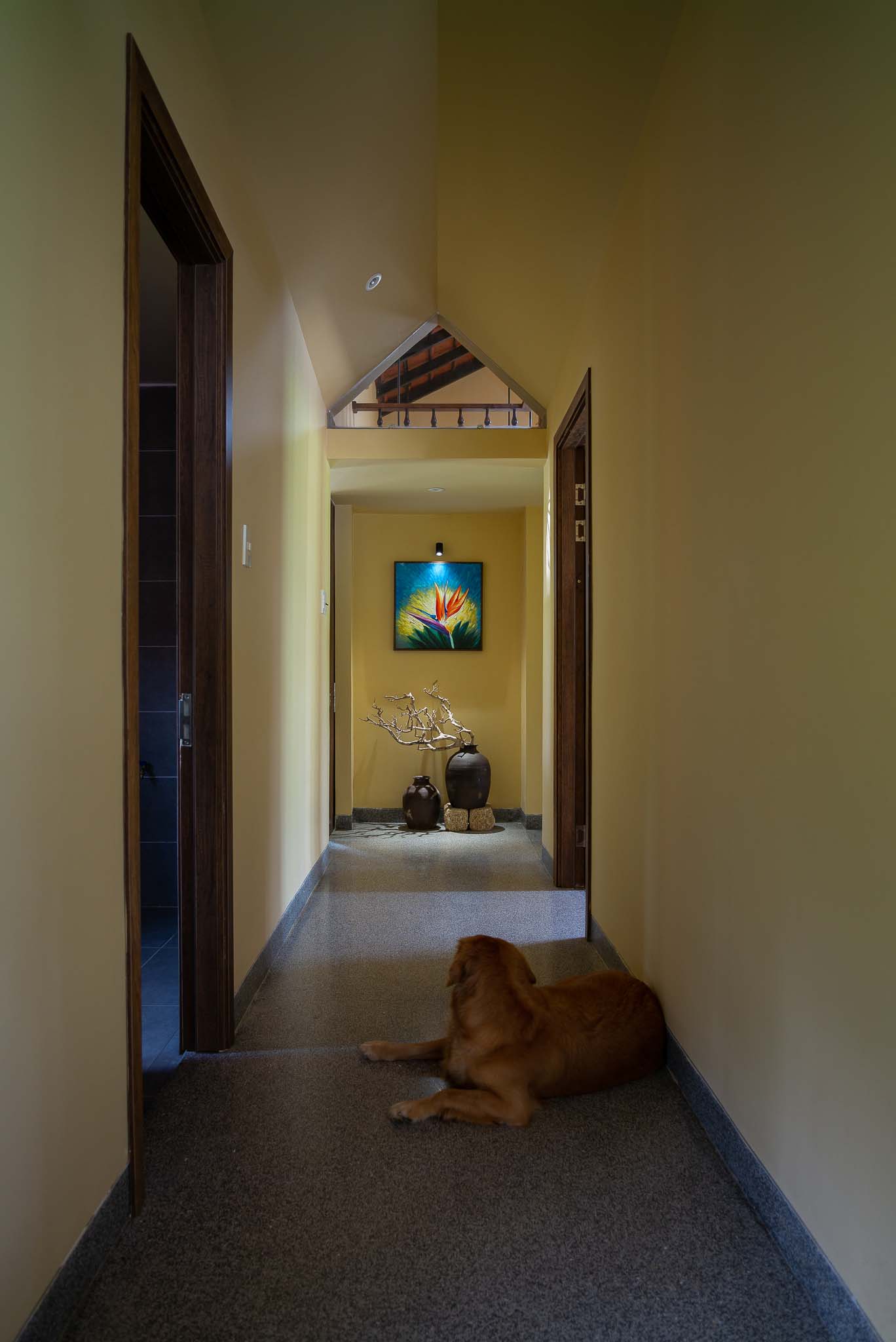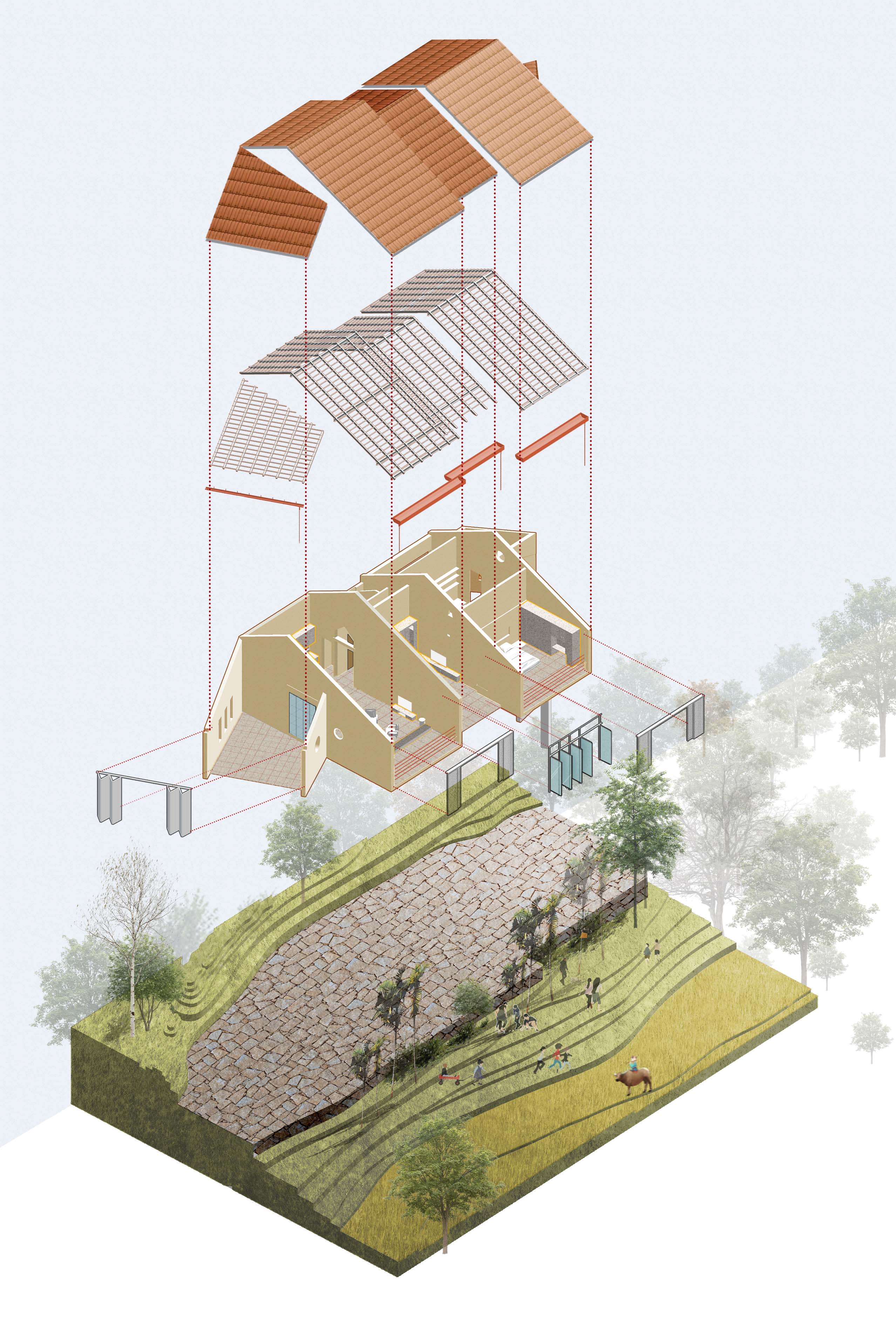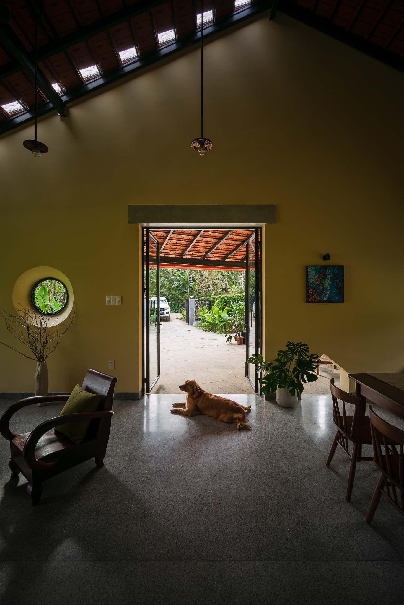 Các không gian chính được tiếp cận trực tiếp với không gian ngoài trời qua các ô cửa đi và cửa sổ lớn mang đến một không gian thoáng đãng và nhận được ánh sáng tự nhiên, nhìn ra cánh đồng xanh và núi rừng. Trong không gian này ta có thể ngồi bên khung cửa tận mắt trải nghiệm thiên nhiên: nắng, mưa, gió, sương mù, bầu trời. Tạo cảm giác thoải mái cho bản thân và đắm mình trong khung cảnh của những sườn núi đầy sương mù vào mùa đông hay những đồng lúa chín vàng khi đến mùa thu hoạch.
