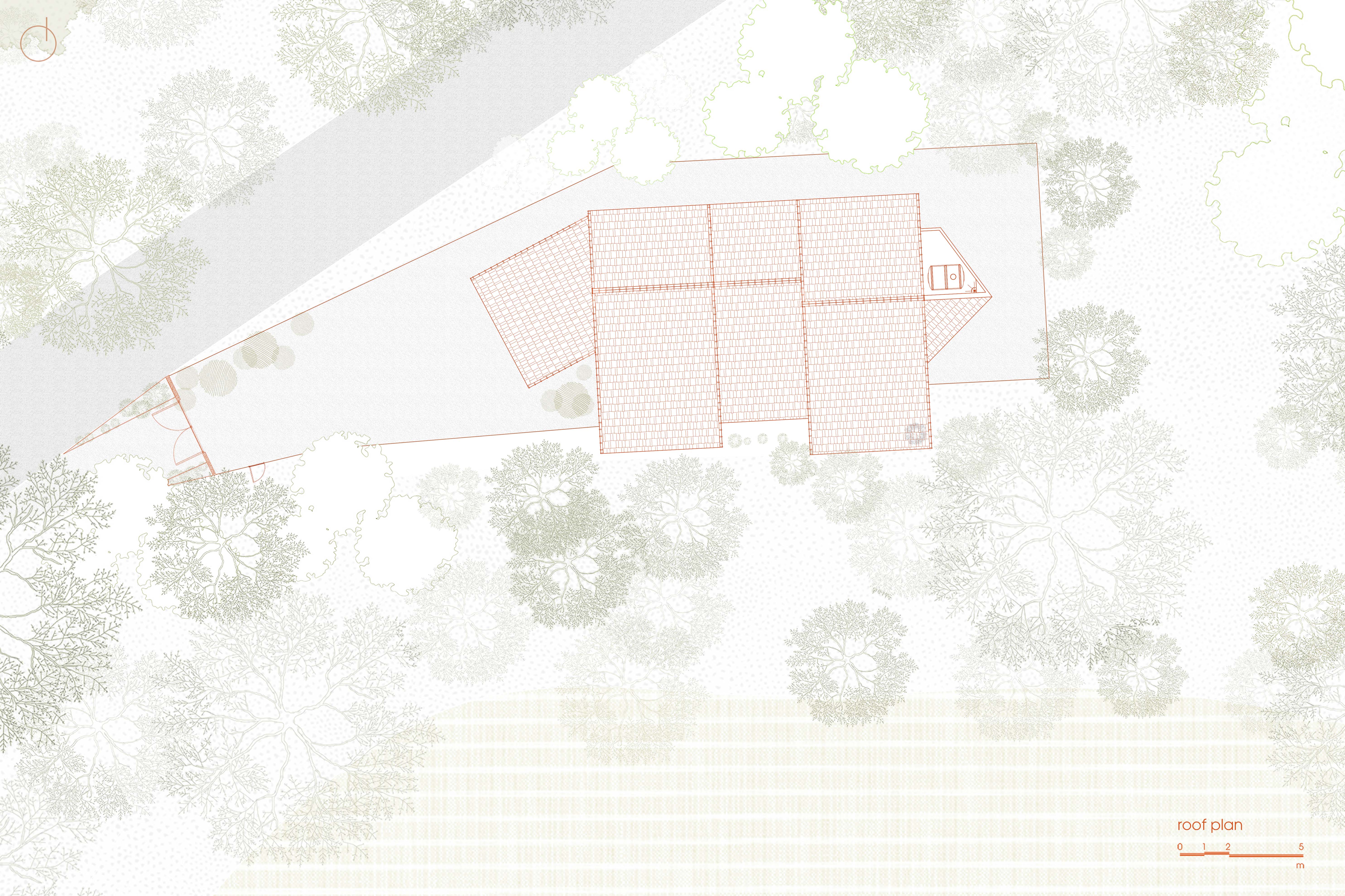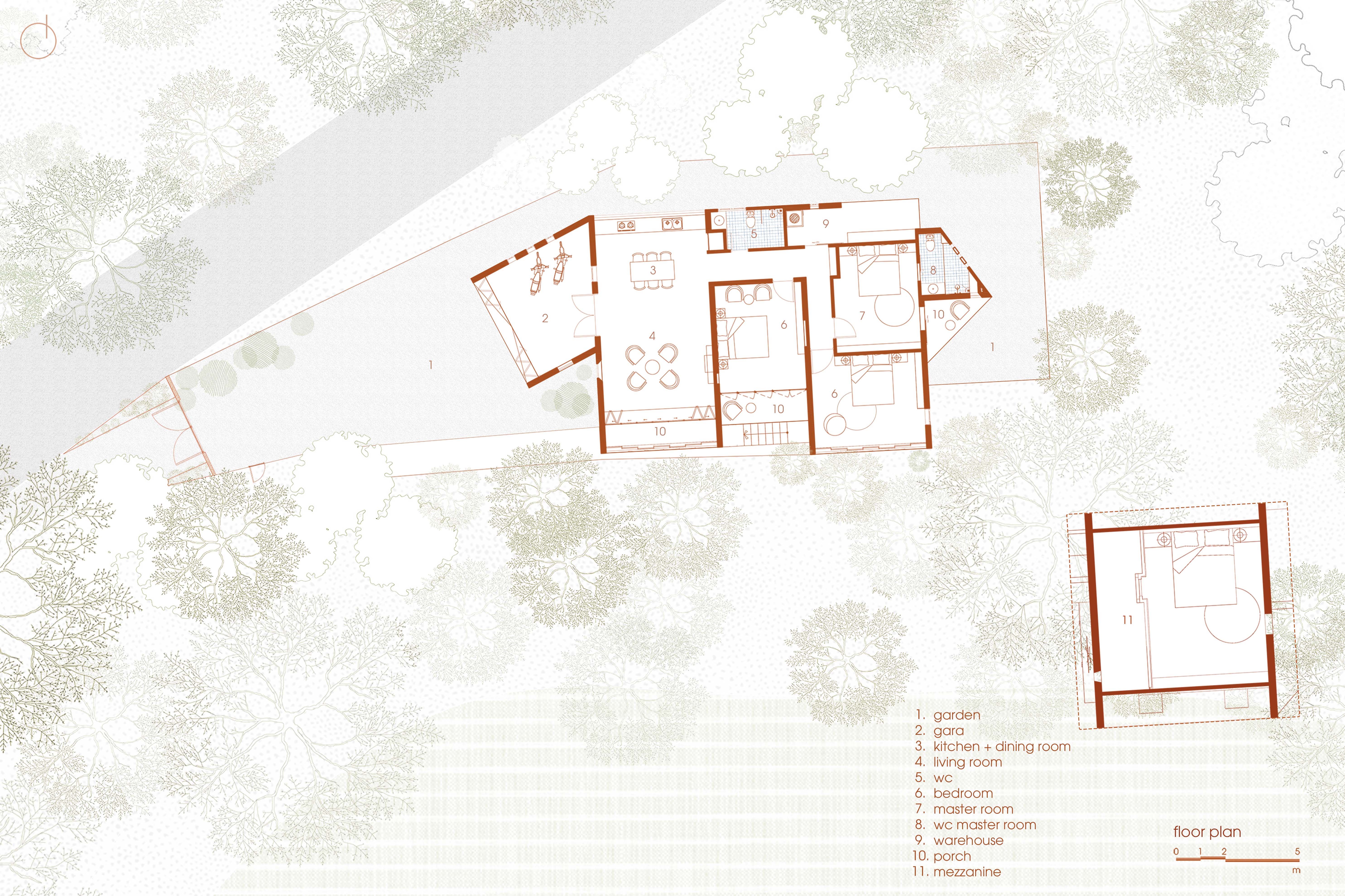 Nhóm thiết kế tận dụng những lợi thế của khu đất, cảnh quan xung quanh, hướng nhìn, hướng gió, đưa ra phương án thay đổi lại hướng chính của ngôi nhà so với căn nhà cũ, bố trí các khu chức năng hiệu quả khi sử dụng. Ngôi nhà là tổ hợp của các hình khối có cao độ mái khác nhau được kết nối lại bằng lối đi hàng lang chung nhưng vẫn đảm bảo được sự riêng tư, khối cao nhất là phòng khách, bếp và ăn, hai khối thấp hơn cho không gian 3 phòng ngủ và hai khối phụ là khu gara và vệ sinh.